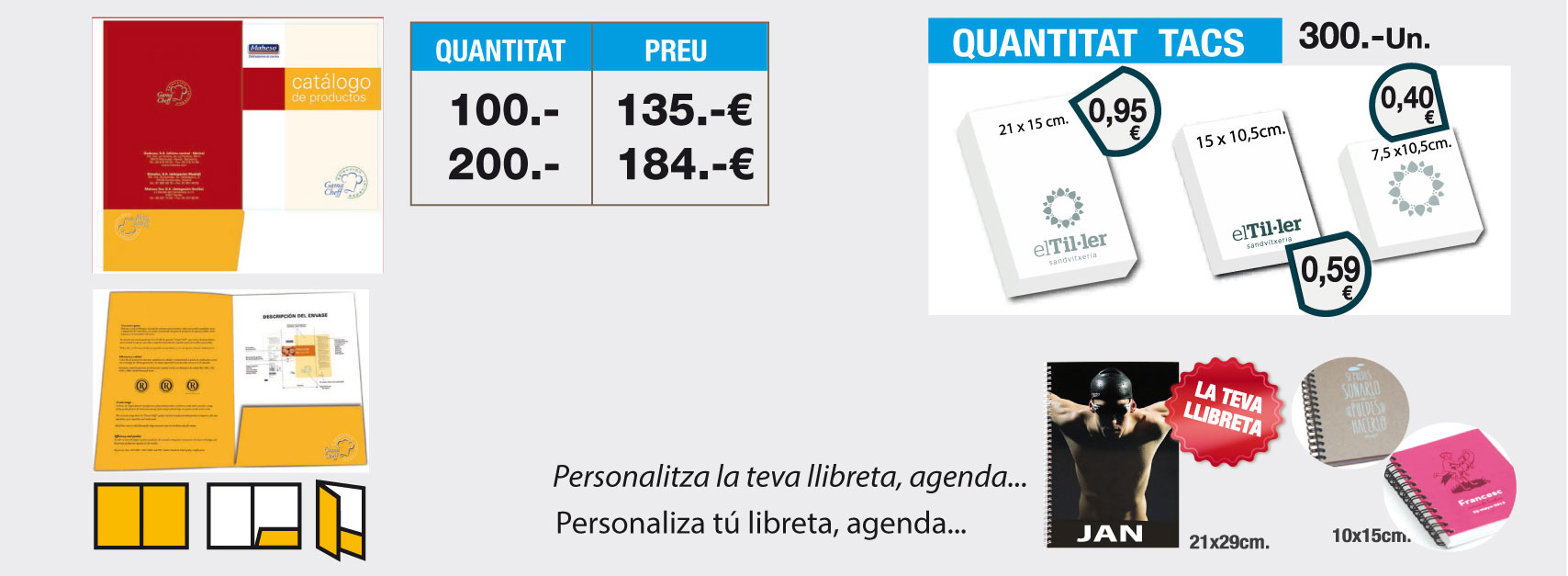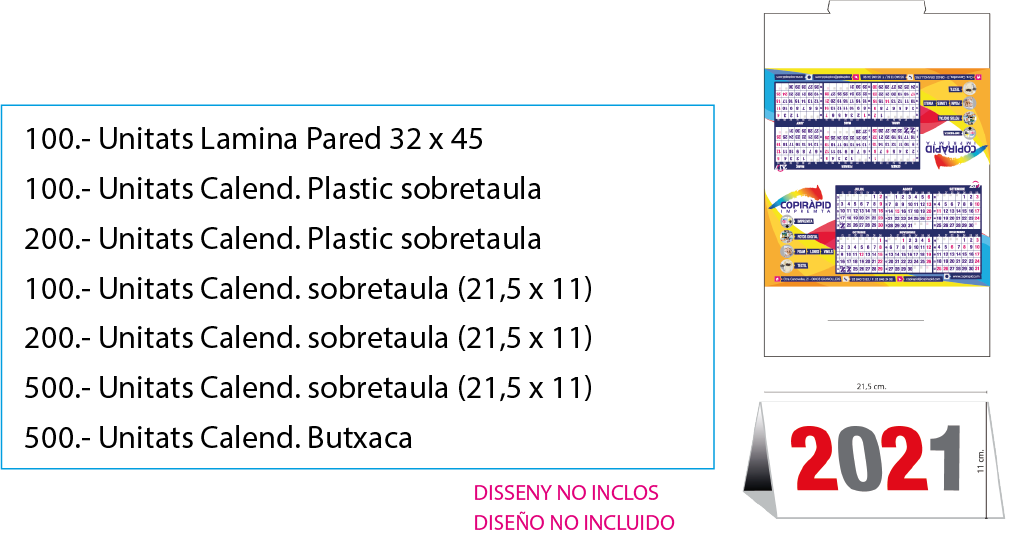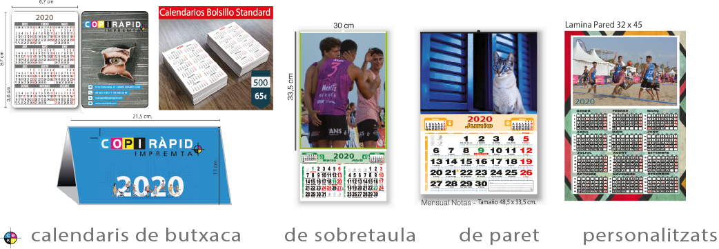 La forma més econòmica d'anunciar la teva empresa durant els 366 dies de l'any 2020. El calendari es considerat com una de les eines publicitàries més efectives, per poder mostrar la teva marca de manera senzilla i econòmica. Donant-li un missatge diferent a la publicitat i imatge de la teva empresa. El calendari és sempre ben rebut pels teus clients com a regal promocional i al mateix temps estarà sempre visible. Àmplia varietat d'acabats, mides i qualitats, donant un toc elegant i pràctic al calendari.